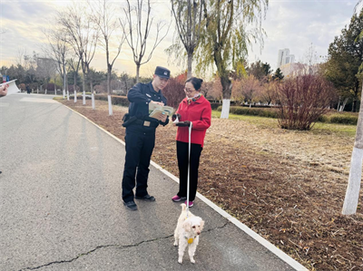 “您家的狗狗辦證了嗎?遛狗時(shí)記得拴繩、清理糞便,既是對(duì)他人負(fù)責(zé),也是保護(hù)毛孩子的安全!”在青城公園內(nèi),呼和浩特市公安局治安管理和特巡警支隊(duì)的民警手持宣傳冊(cè),向晨練的市民耐心講解文明養(yǎng)犬規(guī)范。他的身旁,一只佩戴著二維碼犬牌的泰迪犬正乖巧地依偎在主人腳邊,引來(lái)不少市民駐足詢問(wèn)。這一幕,正是呼和浩特市文明養(yǎng)犬專項(xiàng)行動(dòng)的生動(dòng)縮影。