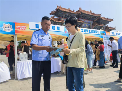 2025年6月28日,在呼和浩特市體育場,市民劉先生走到呼和浩特市公安局治安管理和特巡警支隊設(shè)立的文明養(yǎng)犬宣傳攤位前詢問。攤位上“文明養(yǎng)犬 愛我青城”的橫幅格外醒目,吸引了不少像劉先生這樣駐足咨詢的市民。