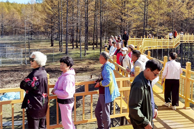 游客們沿著步道欣賞林區(qū)景觀。(來源:阿榮旗融媒體中心)