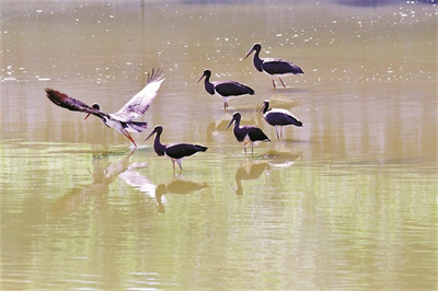 夏日的傍晚,桃河展現(xiàn)出一天中最迷人的姿態(tài)。河水在落日的映襯下泛起粼粼波光,宛如一塊鋪展開的巨大綢緞。黑鸛、紅嘴藍(lán)鵲在河面“翩翩起舞”,給“畫布”增添了別樣的色彩?!斑青辍?,攝影愛好者何瓊按下快門,記錄下人與自然和諧共生的美景。