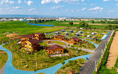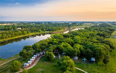 呼和浩特市玉泉區(qū)大黑河郊野公園“清嶼林夕房車營地”與朵朵白云相映成趣,構(gòu)成一幅愜意的郊野畫卷。(攝影:丁根厚)