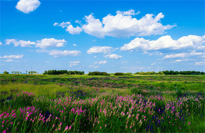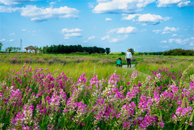 呼和浩特市玉泉區(qū)大黑河郊野公園觀光帶內(nèi),繽紛花海與藍天白云相映成趣,景美如畫。(攝影:丁根厚)