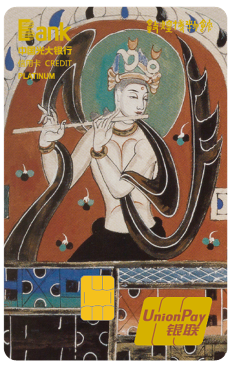 光大敦煌聯(lián)名信用卡卡面設(shè)計取材于敦煌壁畫,有敦煌大智文殊白金卡、敦煌天宮伎樂白金卡以及敦煌五百強盜成佛菁英白金卡三種信用卡。光大敦煌聯(lián)名信用卡的卡面設(shè)計靈感均來源于敦煌壁畫,大智文殊白金卡畫面為文殊菩薩結(jié)跏坐于青面獅虬首仙獅背上。文殊菩薩是專司智德、辯才第一的大菩薩,尊號“大智文殊”。天宮伎樂白金卡主體畫面為伎樂天,取材于莫高窟288窟,營造了佛陀講經(jīng)說法時佛國世界歡樂祥和的氛圍。五百強盜成佛菁英白金卡卡面設(shè)計取自“五百強盜成佛”的壁畫故事,佛用神通使被剜去雙眼的強盜重見光明,并對他們進行點化,五百強盜潛心苦修終成五百羅漢。光大敦煌聯(lián)名信用卡的卡面設(shè)計將傳統(tǒng)文化融入現(xiàn)代金融產(chǎn)品,極具敦煌文化的風格。