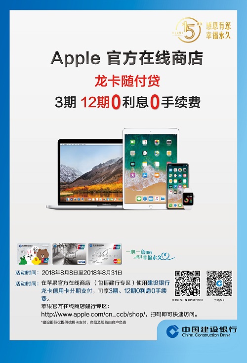 2018年8月8日至8月31日,持卡人至蘋果在線商店官網(wǎng)及建行專區(qū)使用龍卡信用卡分期支付,可享受3期、12期0利息0手續(xù)費優(yōu)惠(如持卡人選擇其他期數(shù)仍需支付手續(xù)費)