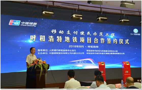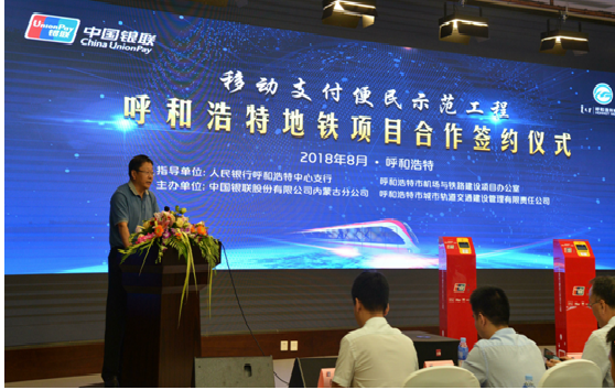 呼和浩特市城市軌道交通建設(shè)管理有限責(zé)任公司劉占英董事長在講話中表示,呼市地鐵項目建設(shè)目前正在穩(wěn)步推進中,作為自治區(qū)首個地鐵項目,在土建施工、機電設(shè)備設(shè)計等方面均爭取打造國內(nèi)軌道交通精品工程。呼市因地鐵弱電系統(tǒng)采用云計算、大數(shù)據(jù)平臺方案,已被中國軌道交通協(xié)會列為全國兩個示范城市之一。本次與銀聯(lián)的合作,將使呼市地鐵在移動支付方面處于國內(nèi)領(lǐng)先水平,不僅節(jié)省了軌道交通運營成本,更為市民乘坐地鐵出行提供了極大的便利。