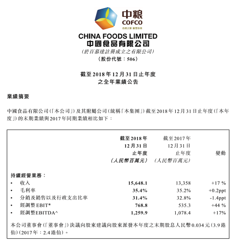 3月26日,中國食品(00506.HK)發(fā)布截至2018年12月31日的全年業(yè)績報告。報告期內(nèi),中國食品可持續(xù)性經(jīng)營業(yè)務實現(xiàn)全年總營收156.48億元(單位:人民幣,下同),同比增幅達17.14%,凈利潤同比增長23.32%至5.76億,實現(xiàn)收入與利潤雙增長。