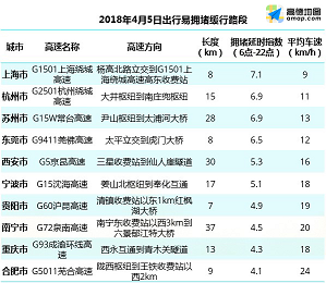 從高速擁堵路段分布來看,出程擁堵緩行路段主要集中在東部、南部、西南部地區(qū)。預(yù)計4月5日出程,上海繞城高速(楊高北路立交到G1501上海繞城高速高東收費站)交通壓力較大,全天擁堵延時指數(shù)7.1,平均車速9km/h,意味著此時通過該路段的時間是暢通時的7.1倍。此外,杭州繞城高速(大井樞紐到南莊兜樞紐)、蘇州G15常臺高速(尹山樞紐到太浦河大橋)、東莞G9411莞佛高速(太平立交到虎門大橋)交通壓力也較大,全天擁堵延時指數(shù)也在6.0以上。