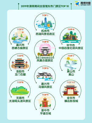 《報告》顯示,清明小長假期間,全國駕車十大熱門景區(qū)中,杭州西湖風景名勝區(qū)出行熱度最高,其次是西塘古鎮(zhèn)景區(qū)、鳳凰古城景區(qū)、中國百里杜鵑風景區(qū)、龍門石窟、烏鎮(zhèn)風景區(qū)、黃山、太湖黿頭渚風景區(qū)、平遙古城、橫店影視城。