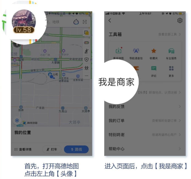 目前,“小店發(fā)光”計劃包含三個部分。其一,讓小店入駐更方便。高德地圖將小店入駐入口調(diào)整至更明顯的位置,點(diǎn)擊主頁面左上角頭像,選擇“我是商家”即可,方便查找,方便入駐。小店主上傳小店和營業(yè)執(zhí)照的照片,填寫相關(guān)信息,高德地圖將24小時內(nèi)完成審核、上線。全過程不需中介,完全自主、免費(fèi)。