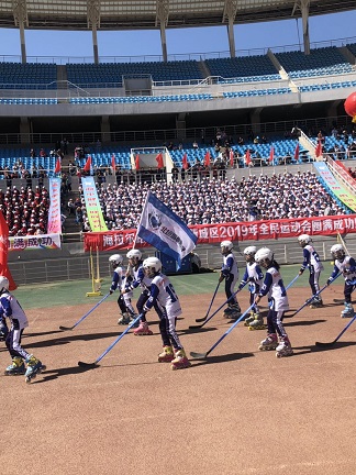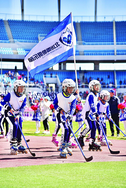 在開幕式的隊伍中,出現(xiàn)了一批身形矯健、全副武裝的小朋友,他們是來自北垣小學(xué)的雪狼俱樂部陸地冰球隊。