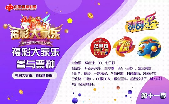 第11季福彩大家樂參與票種為電腦票(雙色球、3D、七樂彩);15款刮刮樂指定票種(如下圖)。