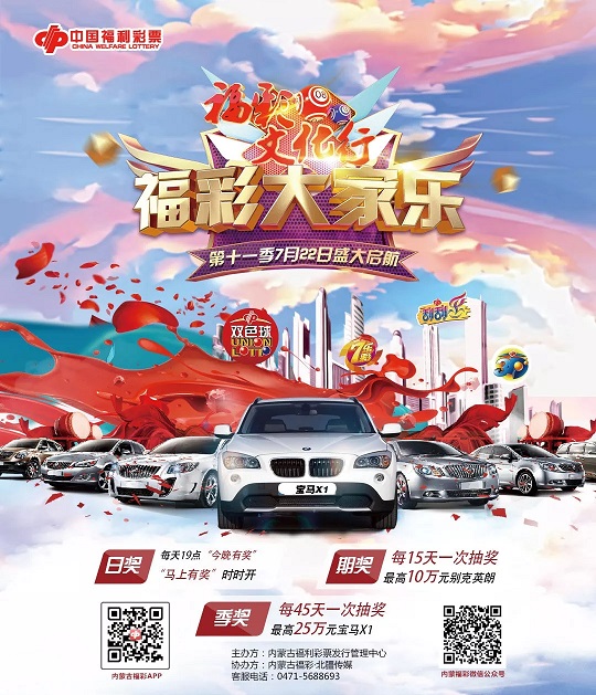 下載“內蒙古福彩APP”或關注“內蒙古福彩”微信公眾號,掃描以下票種≥10元,即可獲得福彩大家樂游戲次數(shù)參與日獎游戲,并且自動入圍至期獎、季獎抽取范圍!