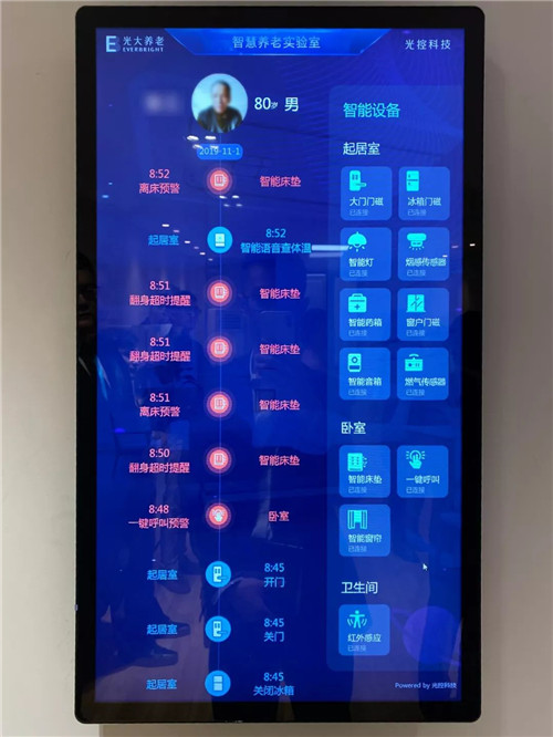 當(dāng)天,李曉鵬、吳利軍、蔡允革、付萬軍一行還參觀了光大養(yǎng)老智慧養(yǎng)老實驗室。通過智能設(shè)備,構(gòu)建云服務(wù)平臺、物聯(lián)網(wǎng)智護(hù)平臺和AI大數(shù)據(jù)三大技術(shù)平臺,可全天候監(jiān)測入住老人的健康數(shù)據(jù)、屋內(nèi)設(shè)備運轉(zhuǎn)情況、冰箱開關(guān)情況等,提供健康服務(wù)、安全服務(wù)、護(hù)理服務(wù)、輔助服務(wù)四類核心養(yǎng)老服務(wù),用有溫度的科技守護(hù)老人的健康安全。