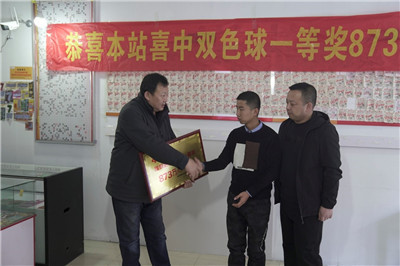 12月11日上午,呼和浩特市福利彩票發(fā)行管理中心副主任魏彥峰攜市場一部部長王可心及宣傳部工作人員來到呼市賽罕區(qū)金隅時代城西門的第15016596號福彩銷售站,為其頒發(fā)“福利彩票雙色球一等獎873萬元產(chǎn)生銷售站”牌匾。銷售站業(yè)主在站內(nèi)拉起橫幅,張貼喜報,與其他彩民朋友一齊慶祝這激動的時刻。10點30分,由魏彥峰主任和王可心部長共同為銷售站業(yè)主頒匾,祝賀這位兢兢業(yè)業(yè)的業(yè)主,也感謝他為福彩事業(yè)做出的貢獻。