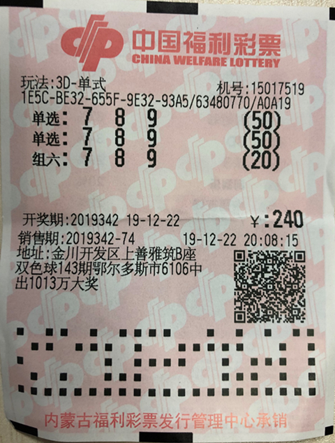 ? ? ?12月22日,3D游戲第2019342期、雙色球游戲第2019147期開(kāi)獎(jiǎng),來(lái)自呼和浩特市金川開(kāi)發(fā)區(qū)上善雅筑B座的第15017519號(hào)和回民區(qū)工人西村后街北云巷的第15015324福彩銷(xiāo)售站各自中出一注3D大獎(jiǎng)和一注雙色球二等獎(jiǎng),獎(jiǎng)金分別為107460元和208693元!
