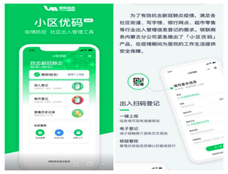在當(dāng)前全國同舟共濟(jì)抗疫情、齊心協(xié)力防病毒的關(guān)鍵時期,銀聯(lián)商務(wù)內(nèi)蒙古分公司堅決貫徹“服務(wù)社會、方便大眾”的經(jīng)營理念,勇?lián)髽I(yè)公民責(zé)任,從疫情防控實際需求出發(fā),積極響2月10日在國務(wù)院召開的聯(lián)防聯(lián)控機(jī)制新聞發(fā)布會上陳越梁司長號召,將社區(qū)防控作為打贏疫情防控阻擊戰(zhàn)關(guān)鍵環(huán)節(jié),第一時間研發(fā)了社區(qū)出入登記軟件——防疫電子信息登記系統(tǒng)“銀商小區(qū)優(yōu)碼”(通用版),供各社會機(jī)構(gòu)和廣大群眾免費(fèi)使用,有效減輕防疫一線人員工作負(fù)擔(dān),同時杜絕因紙筆信息登記造成交叉感染的現(xiàn)象發(fā)生,為全面打贏防控阻擊戰(zhàn)提供強(qiáng)力“武器”!自2月11日正式推出以來深受社會各界的歡迎和廣泛推廣使用。