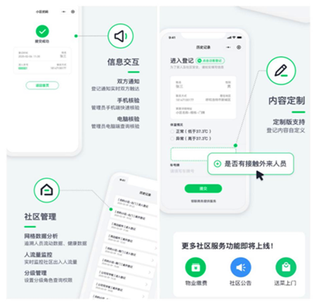 “銀商小區(qū)優(yōu)碼”可杜絕紙筆登記造成交叉感染,同時具有保證人員信息安全,后臺數(shù)據(jù)(脫敏處理)可長期保存、方便查詢,數(shù)據(jù)及時匯總,查詢疑似病例活動軌跡等多方面優(yōu)勢。并可配套提供社區(qū)公告、物業(yè)便民服務(wù)、物資配送上門等服務(wù)。