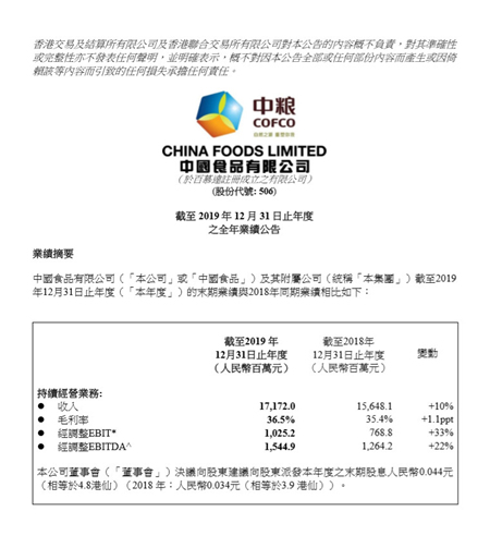 3月24日,中糧可口可樂大股東中國食品有限公司(下稱“中國食品”或“公司”,股票代碼:00506.HK)發(fā)布截至2019年12月31日的全年業(yè)績報告。報告期內(nèi),中國食品銷售總額171.72億元(單位:人民幣,下同),同比增長9.7%,超額完成業(yè)績目標,凈利潤同比勁增30.2%至4.18億元,毛利率同比提升1.1個百分點至36.5%。