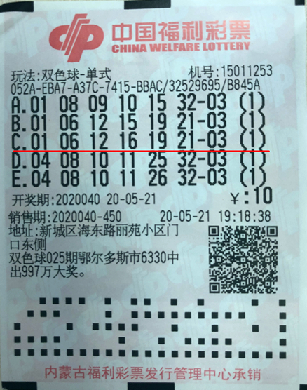 5月21日晚,中國福利彩票雙色球游戲進行第2020040期開獎,來自呼和浩特市新城區(qū)海東路麗苑小區(qū)門口東側的第15011253號福彩銷售站中出一注雙色球二等獎,獎金185882元!