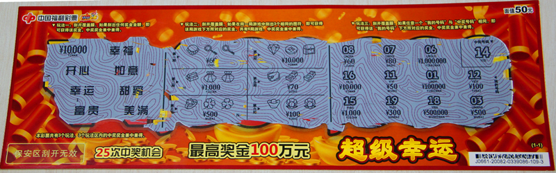 “超級(jí)幸運(yùn)”即開型彩票游戲開展派獎(jiǎng)活動(dòng)正酣,愿廣大彩民朋友都有好運(yùn)的同時(shí),呼市福彩中心再次提醒廣大彩民朋友:量力而行,理性購(gòu)彩。