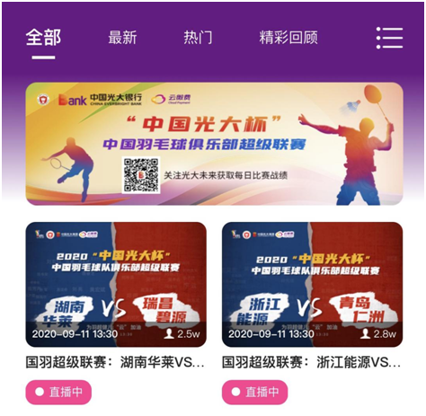 光大云繳費(fèi)作為羽協(xié)的首席合作伙伴,在“云繳費(fèi)直播間”進(jìn)行了為期16天、每天4場(chǎng)精彩紛呈的超級(jí)聯(lián)賽現(xiàn)場(chǎng)直播,有超過(guò)360萬(wàn)球迷通過(guò)“云繳費(fèi)直播間”觀看了比賽,反響熱烈。
