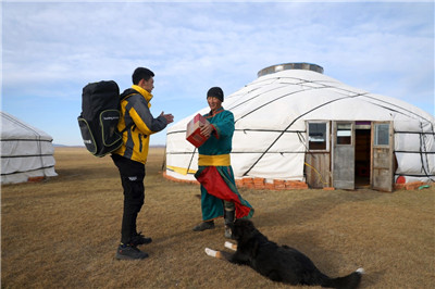 (王公卿為巴雅爾大叔送來快遞,大叔家的狗乖巧的等在一旁)
