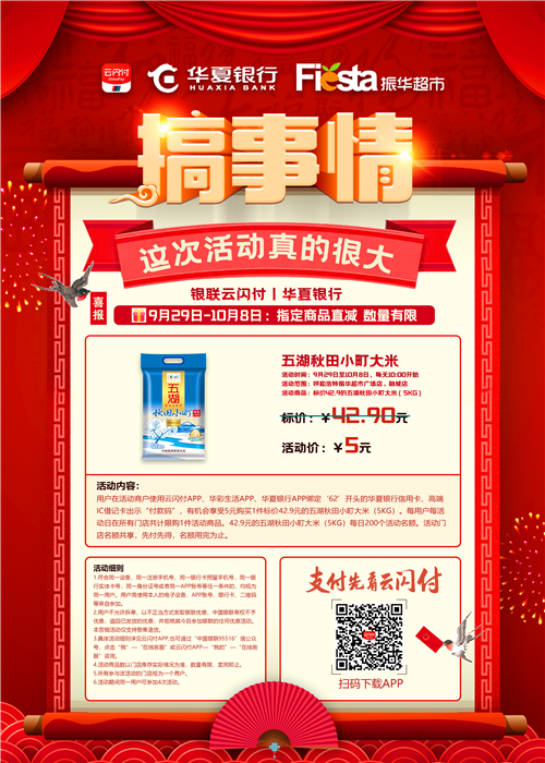 9月29日至10月8日,每天10:00開始活動范圍:呼和浩特振華超市廣場店、融城店活動商品:標(biāo)價42.9的五湖秋田小町大米(5KG)活動內(nèi)容:用戶在活動商戶使用云閃付APP、華彩生活A(yù)PP、華夏銀行APP出示“付款碼”支付,有機(jī)會享受5元購買1件標(biāo)價42.9元的五湖秋田小町大米(5KG)。每用戶每活動日在所有門店共計限購1件活動商品。42.9元的五湖秋田小町大米(5KG)每日200個活動名額?;顒娱T店名額共享,先付先得,名額用完為止。