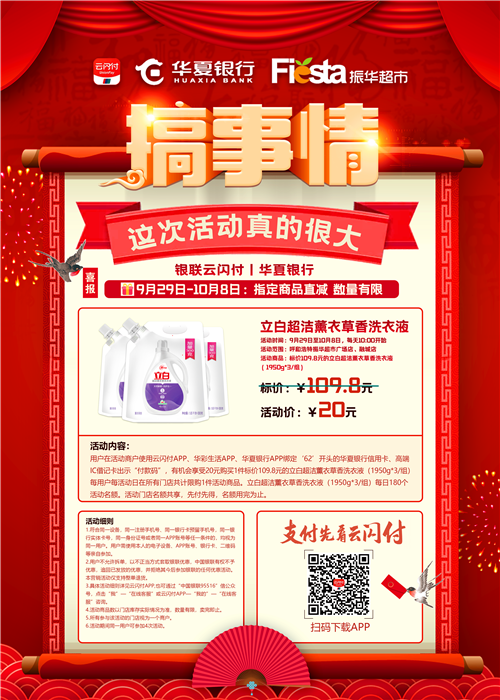 9月29日至10月8日,每天10:00開始活動范圍:呼和浩特振華超市廣場店、融城店活動商品:標(biāo)價109.8元的立白超潔薰衣草香洗衣液(1950g*3/組)活動內(nèi)容:用戶在活動商戶使用云閃付APP、華彩生活A(yù)PP、華夏銀行APP出示“付款碼”支付,有機(jī)會享受20元購買1件標(biāo)價109.8元的立白超潔薰衣草香洗衣液(1950g*3/組)。每用戶每活動日在所有門店共計限購1件活動商品。立白超潔薰衣草香洗衣液(1950g*3/組)每日180個活動名額?;顒娱T店名額共享,先付先得,名額用完為止。