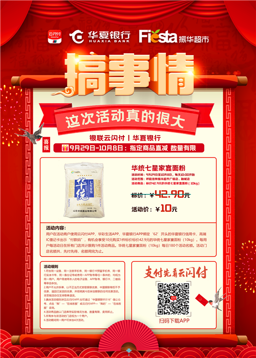 9月29日至10月8日,每天10:00開始活動范圍:呼和浩特振華超市廣場店、融城店活動商品:標(biāo)價42.9元的華統(tǒng)七星家宴面粉(10kg)活動內(nèi)容:用戶在活動商戶使用云閃付APP、華彩生活A(yù)PP、華夏銀行APP出示“付款碼”支付,有機(jī)會享受10元購買1件標(biāo)價標(biāo)價42.9元的華統(tǒng)七星家宴面粉(10kg)。每用戶每活動日在所有門店共計限購1件活動商品。華統(tǒng)七星家宴面粉(10kg)每日180個活動名額?;顒娱T店名額共享,先付先得,名額用完為止。