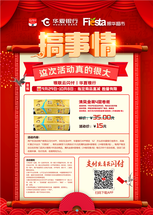 9月29日至10月8日,每天10:00開始活動范圍:呼和浩特振華超市廣場店、融城店活動商品:標(biāo)價35元的清風(fēng)金裝4層卷紙(24卷雙提/組)活動內(nèi)容:用戶在活動商戶使用云閃付APP、華彩生活A(yù)PP、華夏銀行APP出示“付款碼”支付,有機(jī)會享受15元購買標(biāo)價35元的清風(fēng)金裝4層卷紙(24卷雙提/組)。每用戶每活動日在所有門店共計限購1件活動商品。清風(fēng)金裝4層卷紙(24卷雙提/組)每日200個活動名額?;顒娱T店名額共享,先付先得,名額用完為止。