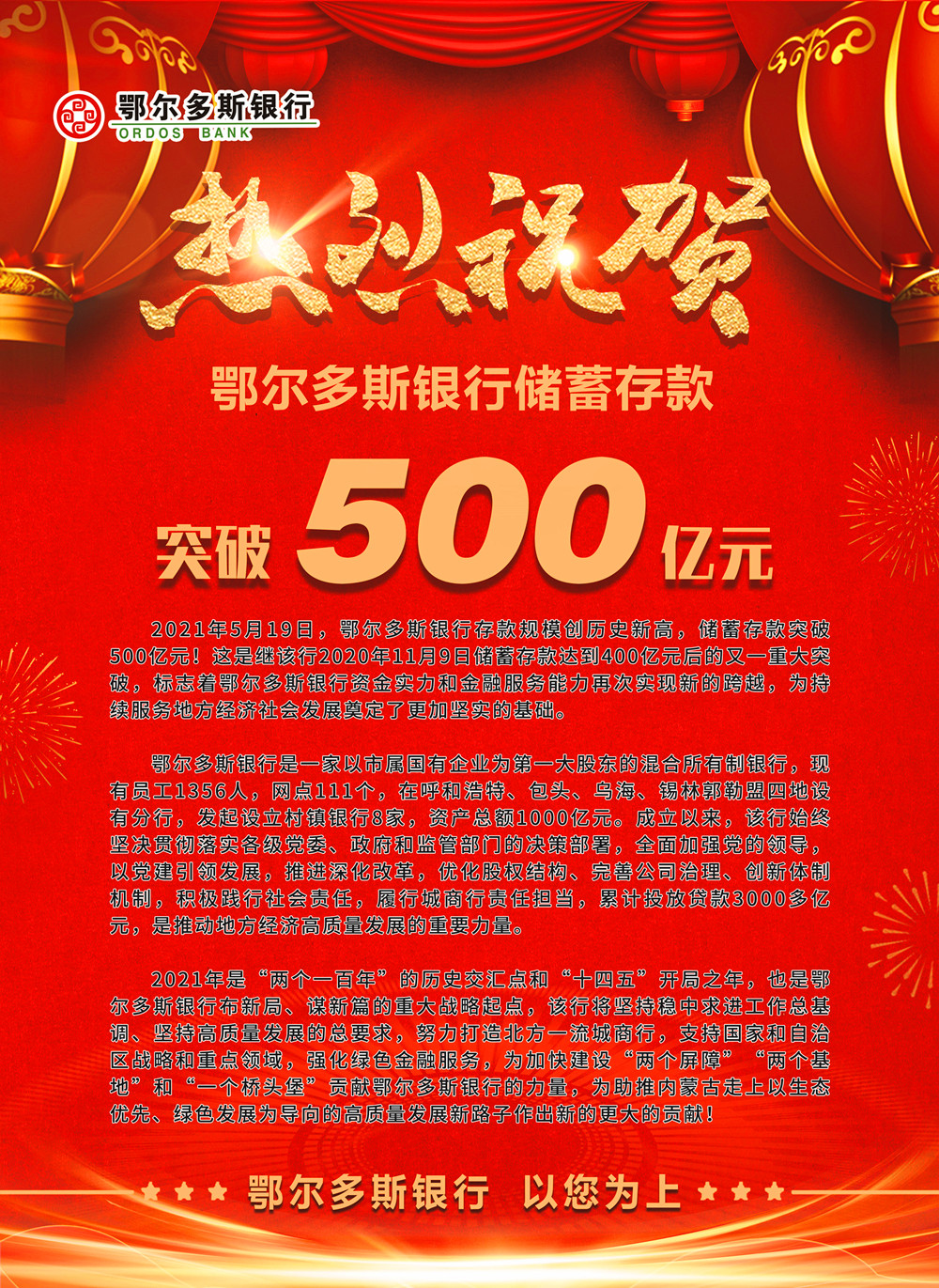 2021年5月19日,鄂爾多斯銀行存款規(guī)模創(chuàng)歷史新高,儲(chǔ)蓄存款突破500億元!