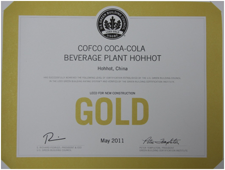 2011年5月,中糧可口可樂內(nèi)蒙古公司位于和林格爾盛樂經(jīng)濟園區(qū)的廠房建設(shè)獲得國際能源與環(huán)境設(shè)計先鋒(LEED)金級認證,是當時全國可口可樂生產(chǎn)工廠中首個獲此級別認證的工廠。該項認證體系是目前國際建筑方面最權(quán)威的認證體系,主要涵蓋七大類內(nèi)容,包括:可持續(xù)發(fā)展場地、節(jié)水及水資源利用、節(jié)能及大氣、材料與資源、室內(nèi)環(huán)境品質(zhì)、創(chuàng)新與設(shè)計和本地策略。中糧可口可樂內(nèi)蒙古公司從2009年籌建規(guī)劃開始就按照LEED體系的相關(guān)要求進行設(shè)計和施工。在廠房建設(shè)執(zhí)行過程中,采取了諸如裸土覆蓋、最大可能綠化土地、雨水收集灌溉綠化、使用低流量潔具、廠房內(nèi)合理的分區(qū)照明控制、增加自然采光(含太陽能照明)和降低照明功率密度等措施。