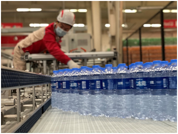 在生產(chǎn)線運行方面,為了提升生產(chǎn)效率,有效降低在生產(chǎn)過程中可能造成的原料、電能等的消耗,2015年、2020年分別投建了生產(chǎn)效率更加高效的吹灌旋一體化生產(chǎn)線。通過技術(shù)改造和攻關(guān),瓶胚生產(chǎn)從過去外部采購運輸變?yōu)楸緩S注胚,有效降低了因外采產(chǎn)生的能耗和運輸成本。