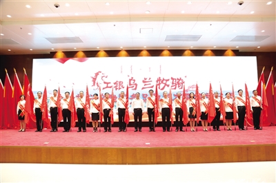 工商銀行內(nèi)蒙古分行黨委書記、行長李峰為工銀“烏蘭牧騎”小分隊(duì)授旗。