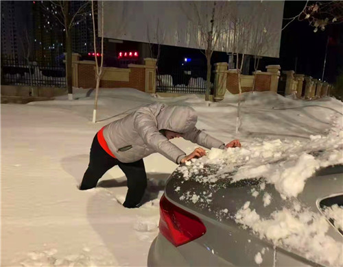 李建國找到僅能作為鏟雪工具的羽毛球拍,幫助客戶鏟除積雪,又協(xié)助客戶一起把車推到了安全區(qū)域。