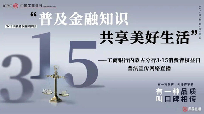 為進(jìn)一步普及金融法律知識,提高公眾金融風(fēng)險防范意識、權(quán)利意識、風(fēng)險責(zé)任意識,引導(dǎo)公眾理性消費并依法維護(hù)自身權(quán)益,構(gòu)建和諧的金融消費環(huán)境,工商銀行內(nèi)蒙古分行將于3月15日,9:30-11:30舉辦“3·15消費者權(quán)益日 普及金融知識 共享美好生活”普法宣傳網(wǎng)絡(luò)直播活動,我們將在直播間帶您解開心中的疑惑,敬請期待!