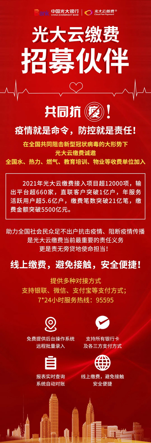 疫情就是命令,防控就是責(zé)任,助力全國(guó)社會(huì)民眾足不出戶抗擊疫情、阻斷疫情傳播是光大云繳費(fèi)當(dāng)前最重要的責(zé)任與義務(wù)。我們誠(chéng)邀全國(guó)水、熱力、燃?xì)?、教育培?xùn)、物業(yè)等收費(fèi)單位加入我們,為抗擊疫情發(fā)光發(fā)熱。