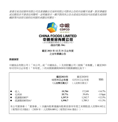 3月29日,中糧集團(tuán)旗下中糧可口可樂所屬的香港主板上市公司“中國食品有限公司”(下稱“中國食品”或公司,股票代碼:00506.HK)發(fā)布2021年全年業(yè)績報(bào)告,營收197.84億元(單位:人民幣,下同),凈利潤10.75億元,分別較上年同期增長14.7%和12.80%。