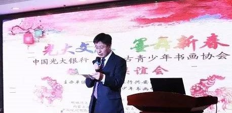 2017年1月4日下午3點(diǎn),呼和浩特市烏蘭察布東街萬戴國際酒店4樓,內(nèi)蒙古青少年書畫協(xié)會與中國光大銀行興安南路支行攜手舉辦“光大文脈 ·墨舞新春”新年聯(lián)誼會活動?;顒佑擅貢L李茂霖主持,中國光大銀行呼和浩特分行李建利行長、書畫協(xié)會蔡德生會長致新年賀辭。