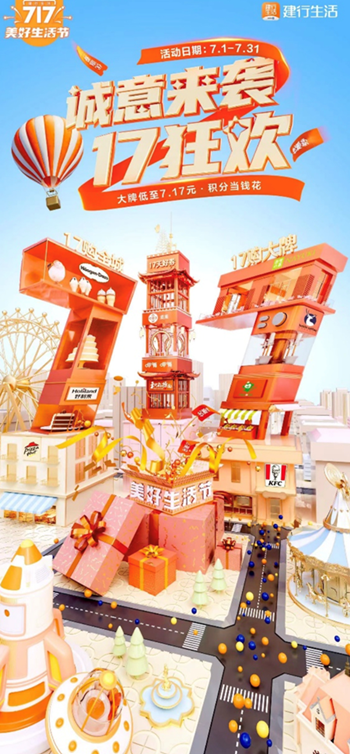 2021年7月,建設(shè)銀行積極踐行“以人民為中心”的新金融理念,以服務(wù)人民美好生活為初心與愿景,重磅推出建行生活app。作為建行全力打造的本地生活服務(wù)平臺,建行生活集餐飲外賣、娛樂出行、充值繳費等場景功能于一體,形成了多樣化新零售、新消費生態(tài)場景,自推出一年以來,已成為中國建設(shè)銀行積極融入百姓煙火、服務(wù)百姓民生的一張閃耀名片。今年7月,在迎來建行生活周年慶之際,為更好回饋廣大用戶,同時也為聚焦民生,踐行責(zé)任,深入貫徹落實“穩(wěn)經(jīng)濟(jì)、保增長、促消費”要求,建行生活全面啟動“717美好生活節(jié)”,圍繞百姓高頻消費的商超、餐飲、外賣、觀影等場景,推出了一系列優(yōu)惠權(quán)益活動,7.17元購瑞幸咖啡代金券,17元購肯德基、必勝客超值套餐,71.7元換購百元餐飲券,好友拼團(tuán)送17元外賣券,消費達(dá)標(biāo)送27元外賣券,更有買菜、買花、書店、觀影萬張好券天天領(lǐng),優(yōu)惠多多,精彩不斷?!?17美好生活節(jié)”豐富的活動為建行生活新老客戶帶來了領(lǐng)券活動新體驗,帶來了實實在在的優(yōu)惠,也為平臺商戶帶來源源不斷的客流,提升平臺商戶客流量與交易額。建行生活以“接地氣”的活動、實實在在的優(yōu)惠,激發(fā)消費動力,釋放消費潛力,促進(jìn)消費增長,重振市場信心,與廣大消費者、商戶同頻共振,真正實現(xiàn)為人民美好生活增添精彩。