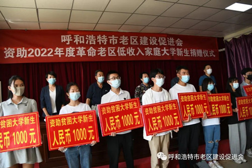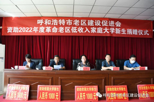 此次捐贈儀式由呼和浩特市老區(qū)建設(shè)促進(jìn)會出資104000元,共資助104名低收入家庭大學(xué)新生,每人資助1000元。