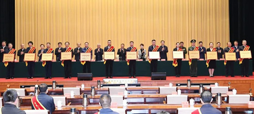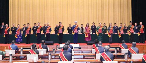 出席大會(huì)的自治區(qū)領(lǐng)導(dǎo)為全區(qū)民族團(tuán)結(jié)進(jìn)步模范個(gè)人頒發(fā)榮譽(yù)證書。