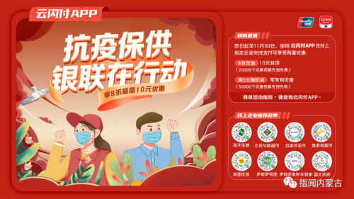 10月12日開始,銀聯(lián)內(nèi)蒙古分公司聯(lián)合多家電商平臺,保障受疫情影響的地區(qū)群眾基本生活物資供應“到家服務”渠道暢通。在“國大藥房”、“圣天生鮮”、“蒙清農(nóng)業(yè)”、“美團優(yōu)選”、“北京華聯(lián)超市”、“維多利超市”、“百家潤超市”等本地微信小程序線上電商商戶,以及京東、淘寶、拼多多、美團等全國電商平臺,呼和浩特地區(qū)云閃付用戶可享受“8折10元封頂”或“隨機滿減”等惠民暖心活動,為疫情期間群眾居家生活提供一站式“到家服務”。