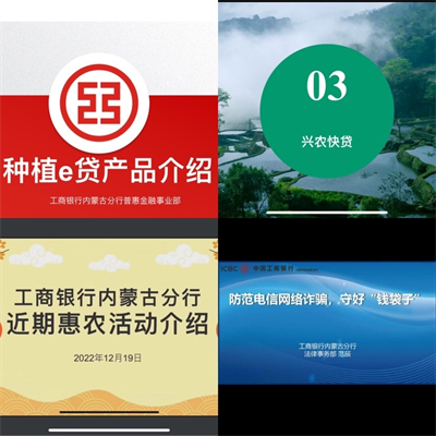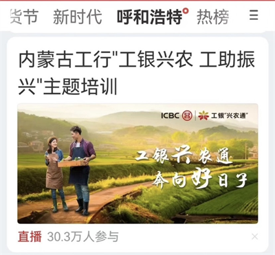 2022年12月19日,工商銀行內(nèi)蒙古分行舉辦線上“工銀興農(nóng) 工助振興”鄉(xiāng)村客戶培訓活動,通過線上直播,面向全區(qū)村干部、產(chǎn)業(yè)帶頭人、農(nóng)牧民等鄉(xiāng)村客群,全面普及工商銀行服農(nóng)產(chǎn)品、惠農(nóng)活動以及金融防詐反詐知識,得到了廣泛響應(yīng)和好評,線上點擊量突破30萬人次。