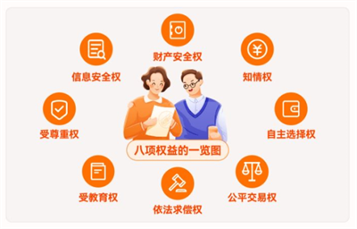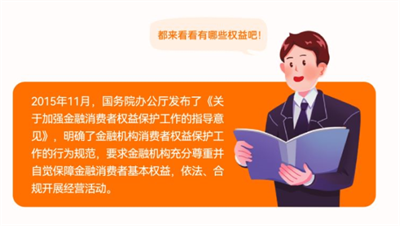 2015年11月13日,國務(wù)院辦公廳發(fā)布了《關(guān)于加強金融消費者權(quán)益保護工作的指導(dǎo)意見》,明確了金融機構(gòu)消費者權(quán)益保護工作的行為規(guī)范,要求金融機構(gòu)充分尊重并自覺保障金融消費者的財產(chǎn)安全權(quán)、知情權(quán)、自主選擇權(quán)、公平交易權(quán)、受教育權(quán)、信息安全權(quán)等基本權(quán)利,依法、合規(guī)開展經(jīng)營活動。這是首次從國家層面對金融消費權(quán)益保護進行具體規(guī)定,強調(diào)保障金融消費者的八項權(quán)利。