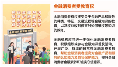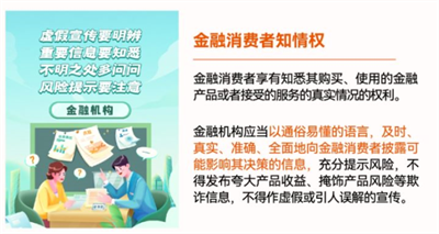 金融機構(gòu)應(yīng)進一步強化金融消費者教育,積極組織或參與金融知識普及活動,開展廣泛、持續(xù)的日常性金融消費者教育,幫助金融消費者提高對金融產(chǎn)品和服務(wù)的認知能力及自我保護能力,提升金融消費者金融素養(yǎng)和誠實守信意識。