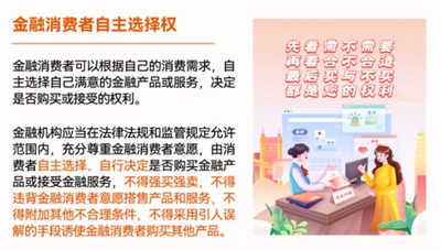 金融機構(gòu)應(yīng)在法律法規(guī)和監(jiān)管規(guī)定允許范圍內(nèi),充分尊重金融消費者意愿,由消費者自主選擇、自行決定是否購買金融產(chǎn)品或接受金融服務(wù),不得強買強賣,不得違背金融消費者意愿搭售產(chǎn)品和服務(wù),或不得附加其他不合理的條件,不得采用引人誤解的手段誘使金融消費者購買其他產(chǎn)品。