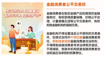 金融機構(gòu)不應(yīng)設(shè)置違反公平原則的交易條件,在格式合同中不得加重金融消費者責任、限制或者排除其合法權(quán)利,不得限制金融消費者尋求法律救濟途徑,不得減輕、免除本機構(gòu)損害金融消費者合法權(quán)益應(yīng)當承擔的民事責任。