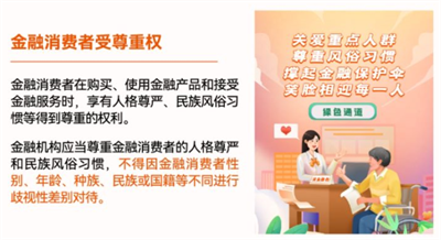 金融機構(gòu)應(yīng)尊重金融消費者的人格尊嚴和民族風俗習慣,不因金融消費者的性別、年齡、種族、民族或國籍等不同而進行歧視性差別對待。