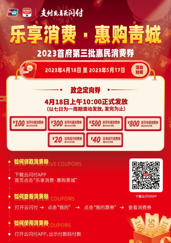 4月18日至5月17日,樂享消費?惠購青城-2023首府第三批惠民消費券正式發(fā)放。本次活動由呼和浩特市人民政府主辦,市商務(wù)局、市財政局承辦,分輪滾動發(fā)放共計3800萬元惠民消費券。消費者可通過“云閃付”APP領(lǐng)取連鎖超市、家用電器消費券,以及申請汽車購置補貼。